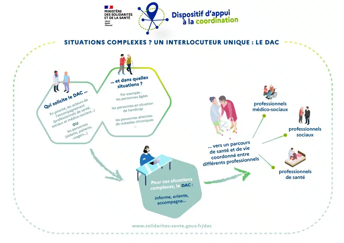 Les DAC, Dispositif d’Appui à la Coordination, proposent une offre adaptée aux besoins des professionnels qui interviennent dans la coordination des personnes en situations complexes, tout âge toutes pathologies confondues.