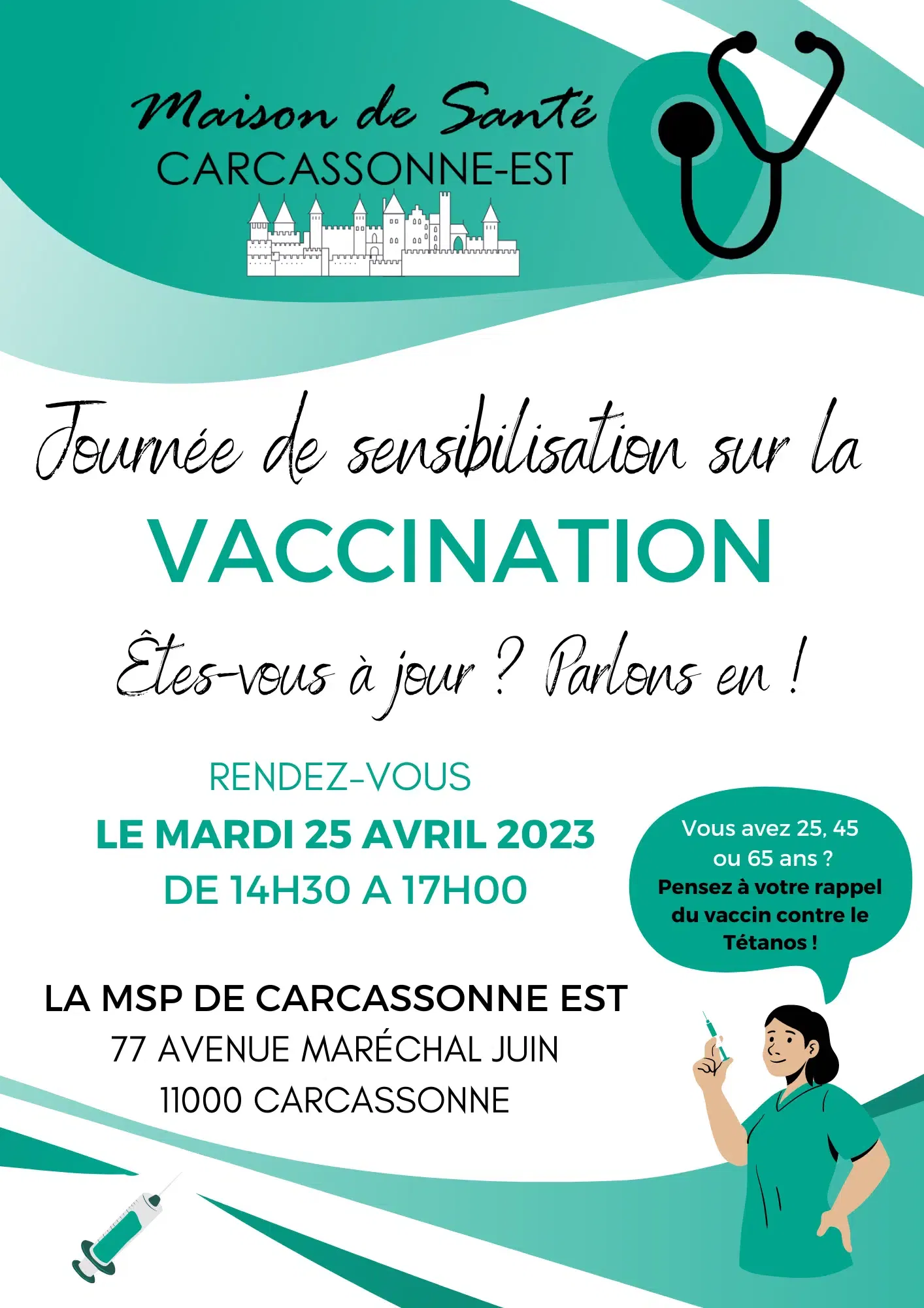 La MSP Carcassonne Est a proposé ce mardi 25 Avril, un après-midi sensibilisation sur la vaccination aux professionnels de la MSP et aux patients de son territoire.