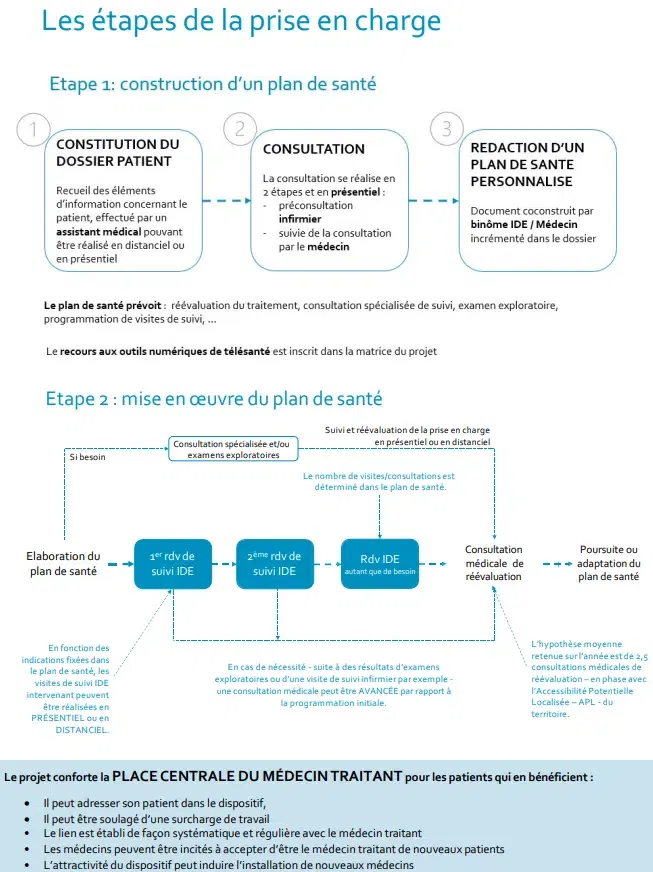 Ce dispositif permet un accès aux soins en ville dans le cadre d’un suivi de prise en charge PROGRAMMEE pour des patients atteints de maladie(s) chronique(s) (reconnus en ALD) et plus largement pour une population sans médecin traitant.