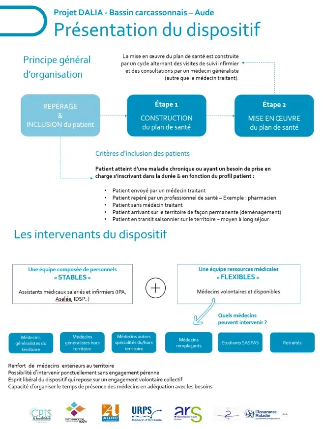 Le projet DALIA – Dispositif Ambulatoire Libéral Innovant d’Accès aux Soins – est expérimenté sur le territoire de Carcassonne depuis le lundi 31 juillet 2023 avec une montée en charge progressive.