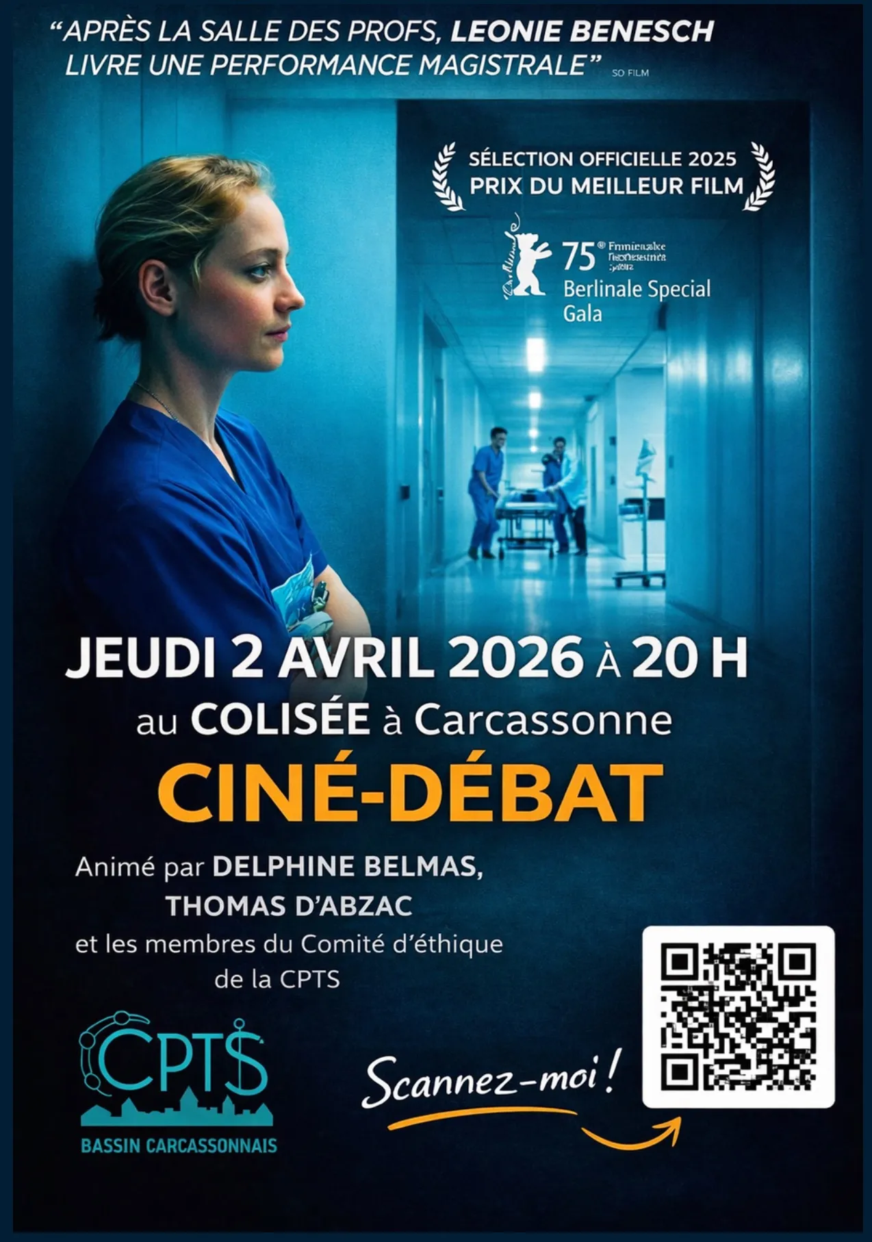 Une soirée pour réfléchir ensemble à l’éthique des soins. La CPTS du Bassin Carcassonnais vous invite à une soirée ciné-débat ouverte à tous, autour du film « En première ligne », un long-métrage qui plonge au cœur du quotidien des soignants et des réalités du système de santé.